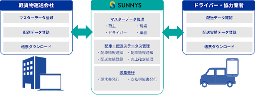 軽貨物運送業を営む上で、軽貨物運送会社がやるべき業務は多岐にわたります。配車連絡や売上データの記録、請求書・支払明細書といった各種帳票書類の作成・送付など。こうした軽貨物運送会社の日常業務について、運用レベルを向上させるとともに、よりスマートに完結できるよう開発したシステムがSUNNYSです。