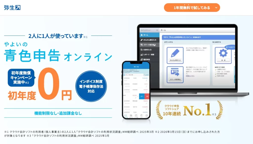 『やよいの青色申告 オンライン』が気になった方は、まずは気になったプランを1年間お試しで利用してみるのもいいかもしれません。