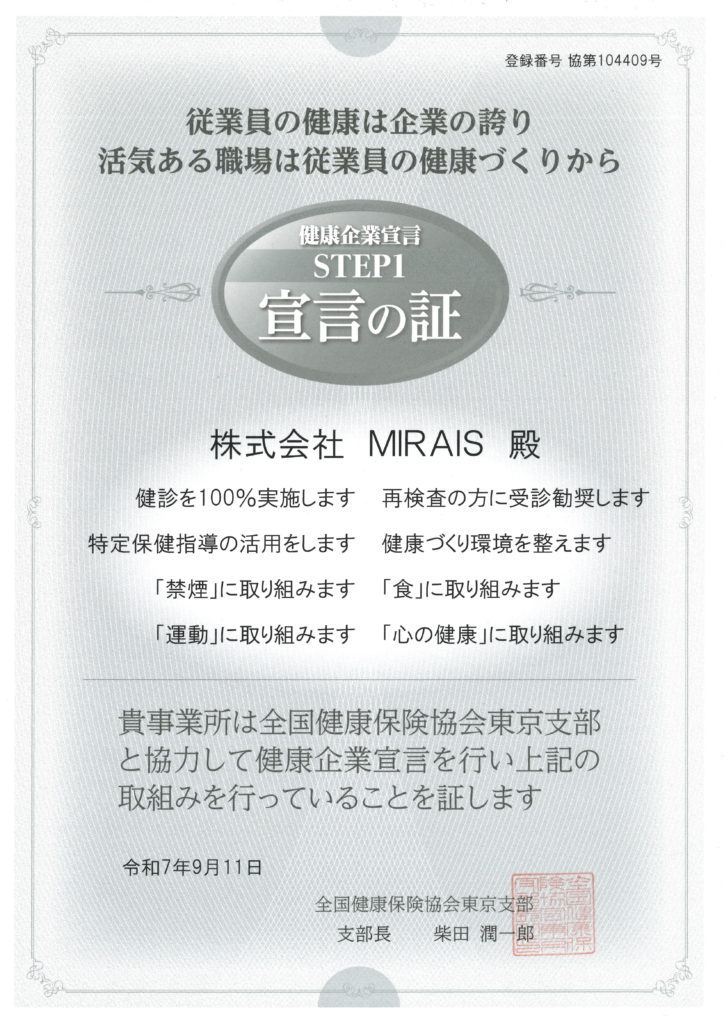 この度、株式会社MIRAISは健康経営推進のため、2025年9月11日付で全国健康保険協会東京支部に健康企業宣言を行い、「宣言の証」を取得しました。